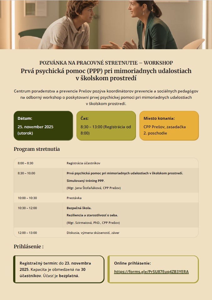 Pracovné stretnutie - PPP pri mimoriadnych udalostiach v šk. prostredí 18.11.2025 Online prihlásenie: https://forms.gle/PrSU87Euq4ZB3YERA
